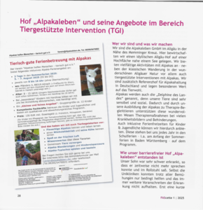 Und noch eine Publikation, die beschreibt, wie Tiere glücklich machen. Hier darf natürlich Alpakaleben nicht fehlen. "Das Band" ist die Zeitschrift des Bundesverbandes für körper- und mehrfachbehinderte Menschen. Der Artikel über uns (Seite 23) beschreibt die fördernde Wirkung unserer Tiere im Überblick.